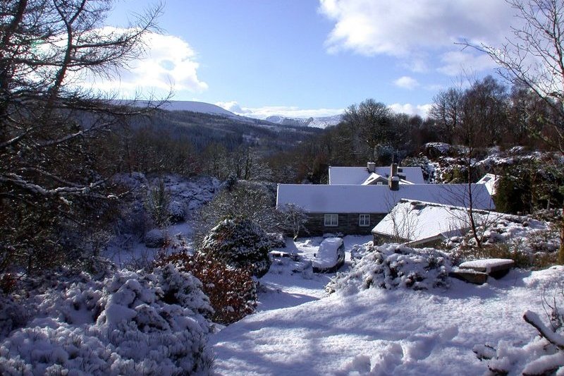Rhiw Goch is a 17th century longhouse on the hillside above the Lledr valley. It is half a mile up a steep climb from the main A470 and sits nicely on a small plateau at 720ft, not that far below the hill top. Its lands extend some 17.5 acres, mostly of unmanaged ancient oak woodland, but with extensive landscaped and managed gardens.